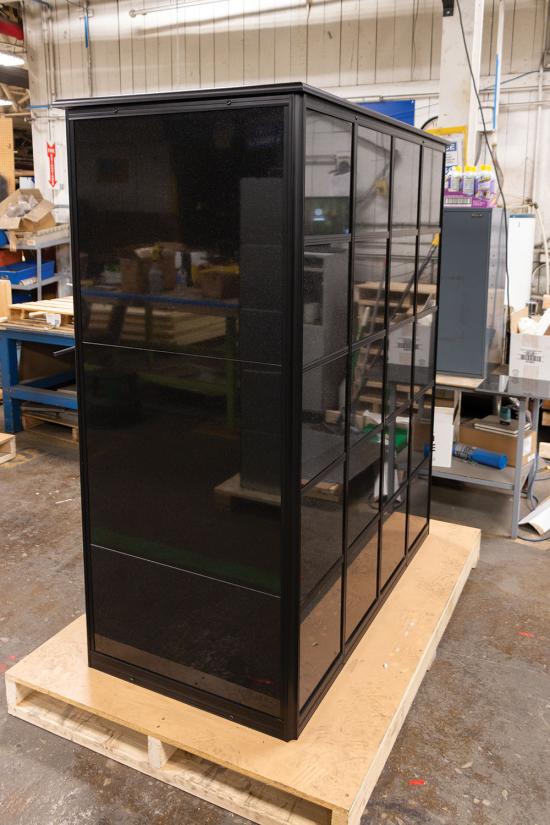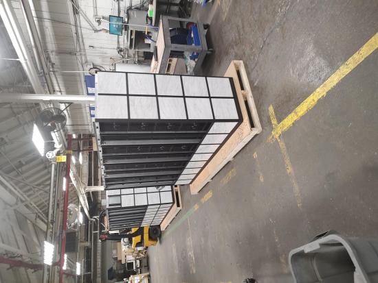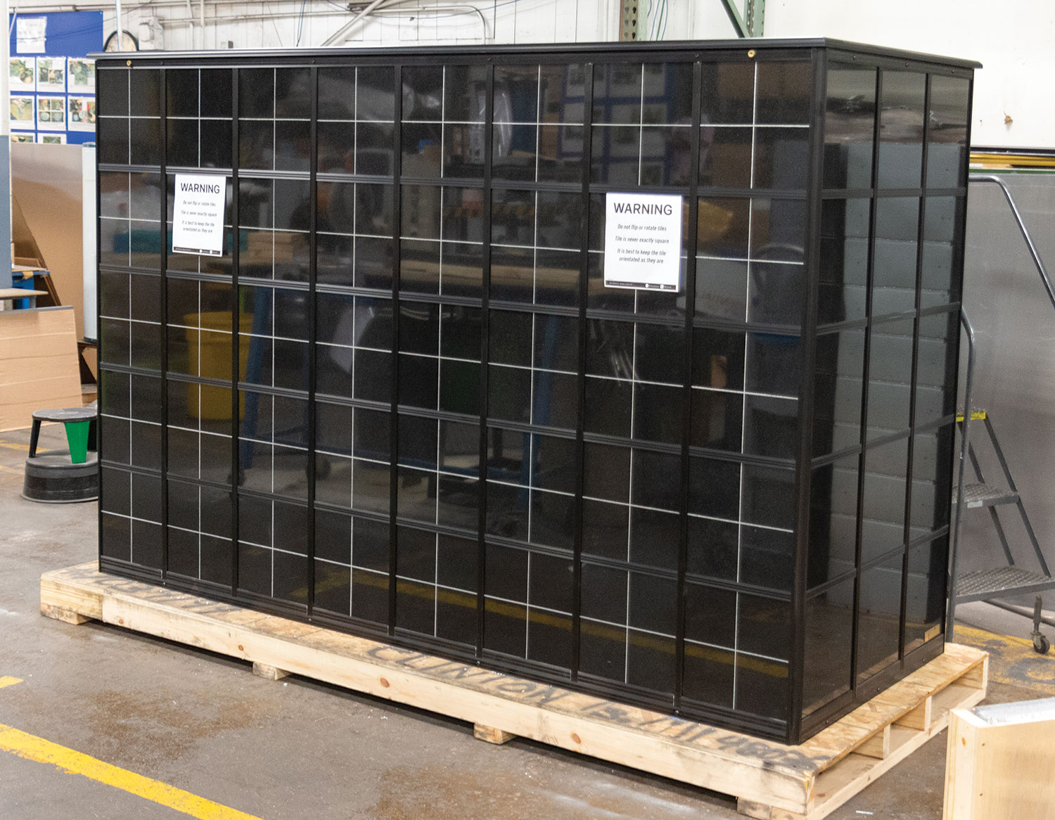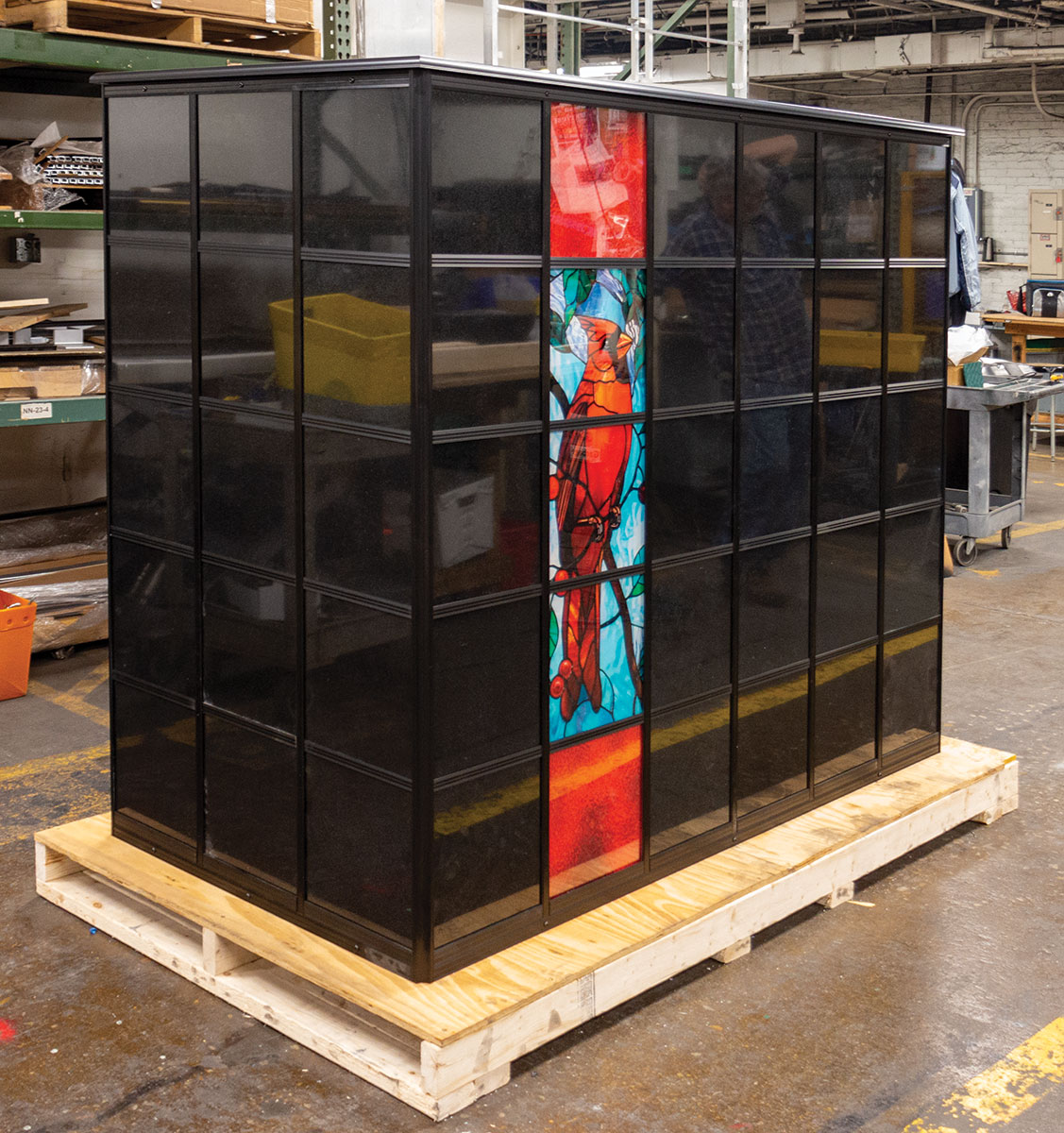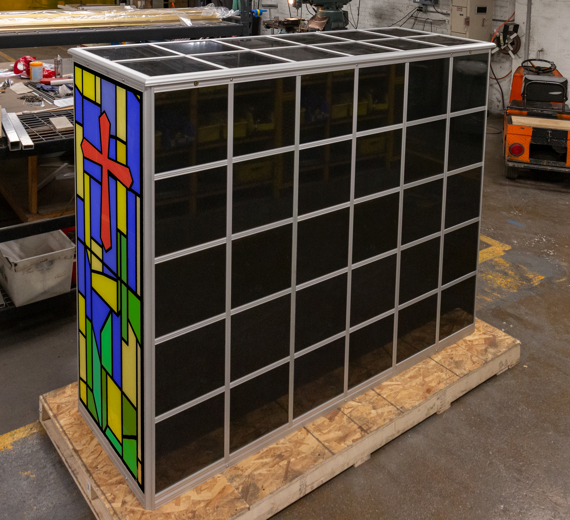 All parts are partitioned and fit together like a puzzle. Niche compartment units are installed into frame weldments. Frame weldments are nested and anchored together forming the internal structure of the columbarium. Extrusions are installed on the exterior and provide a solid structure for laying the granite tiles. Lastly, a roof is attached to the body assembly.