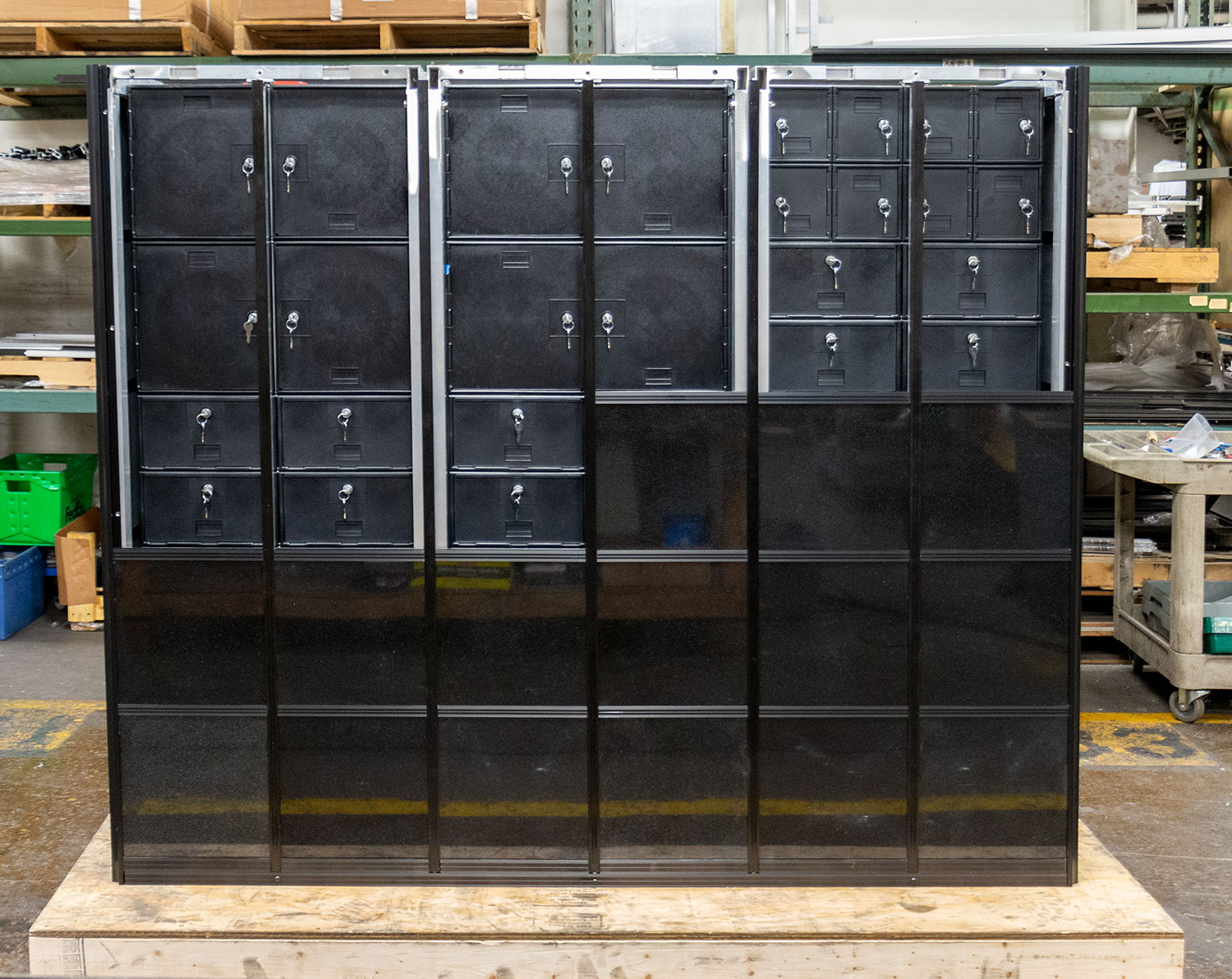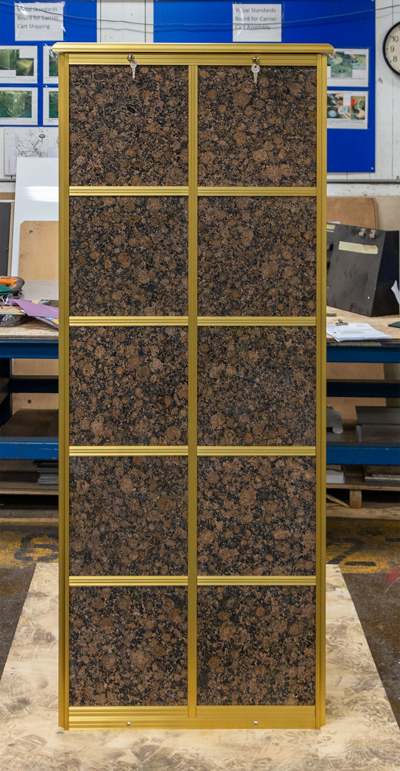 We make it a priority to exclusively manufacture the highest quality columbaria that are designed and constructed with the best materials and craftsmanship. Our elegant columbaria feature a style and construction that will make the best use out of your interior or exterior space. The design eliminates the need for supports, requiring less material and optimizing space. The inner compartments (niches) are made with galvanized steel compartment walls and feature reinforced ribbed polycarbonate nichess. The inside niches feature a secure five pin tumbler lock with unique keys for added security and peace of mind. The niches feature a tamper resistant security cam with a reinforced back lip that makes breaking into the inner niche door difficult at best. Our niche compartments feature the same secure lock system as our private mailbox line and has a proven track record with over a million sold. In addition, the individual niche doors are covered with an outside outer shell of 12”x12” granite tiles inserted into a durable extruded aluminum track which is anodized black for decades of weatherability. Each columbarium is designed and manufactured to be weather-resistant.