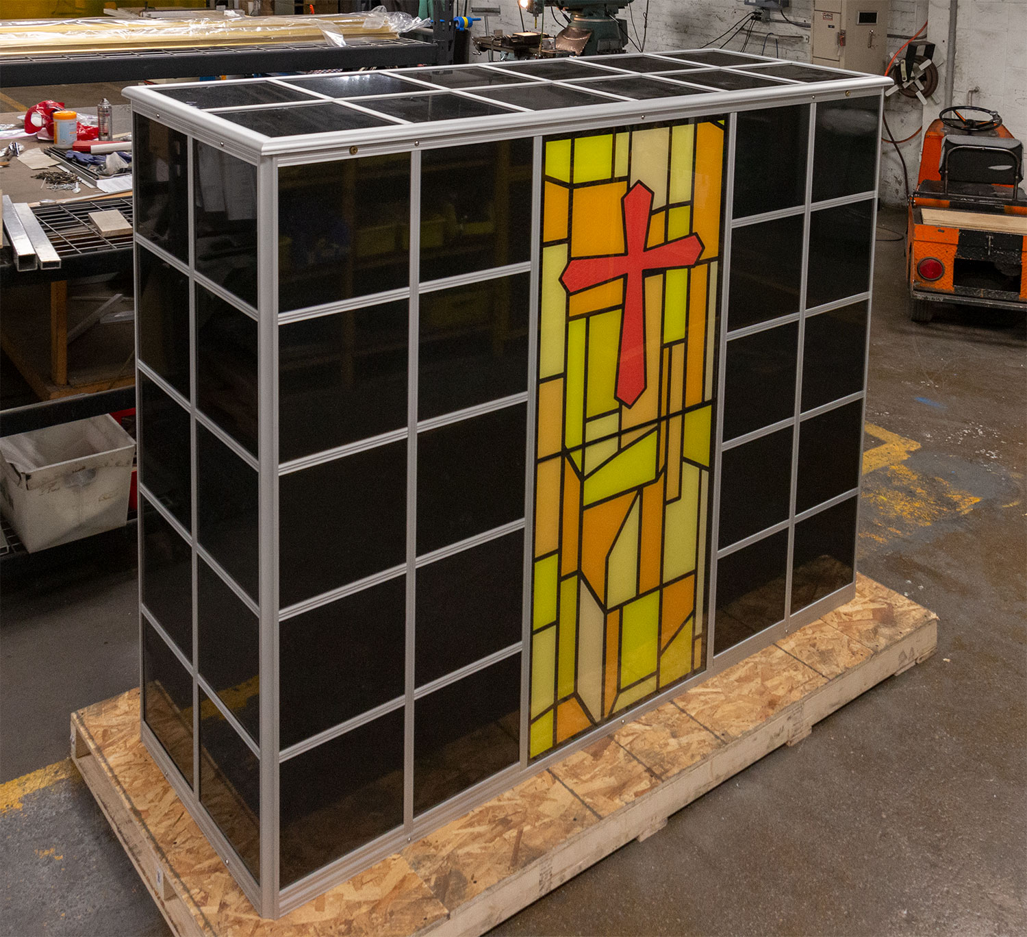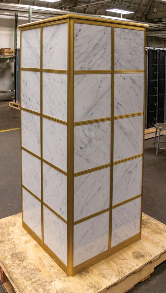Columbariums are constructed with aluminum extrusions, frame weldments, sheet metal compartments, polycarbonate niches, plastic dividers, and granite tiles.